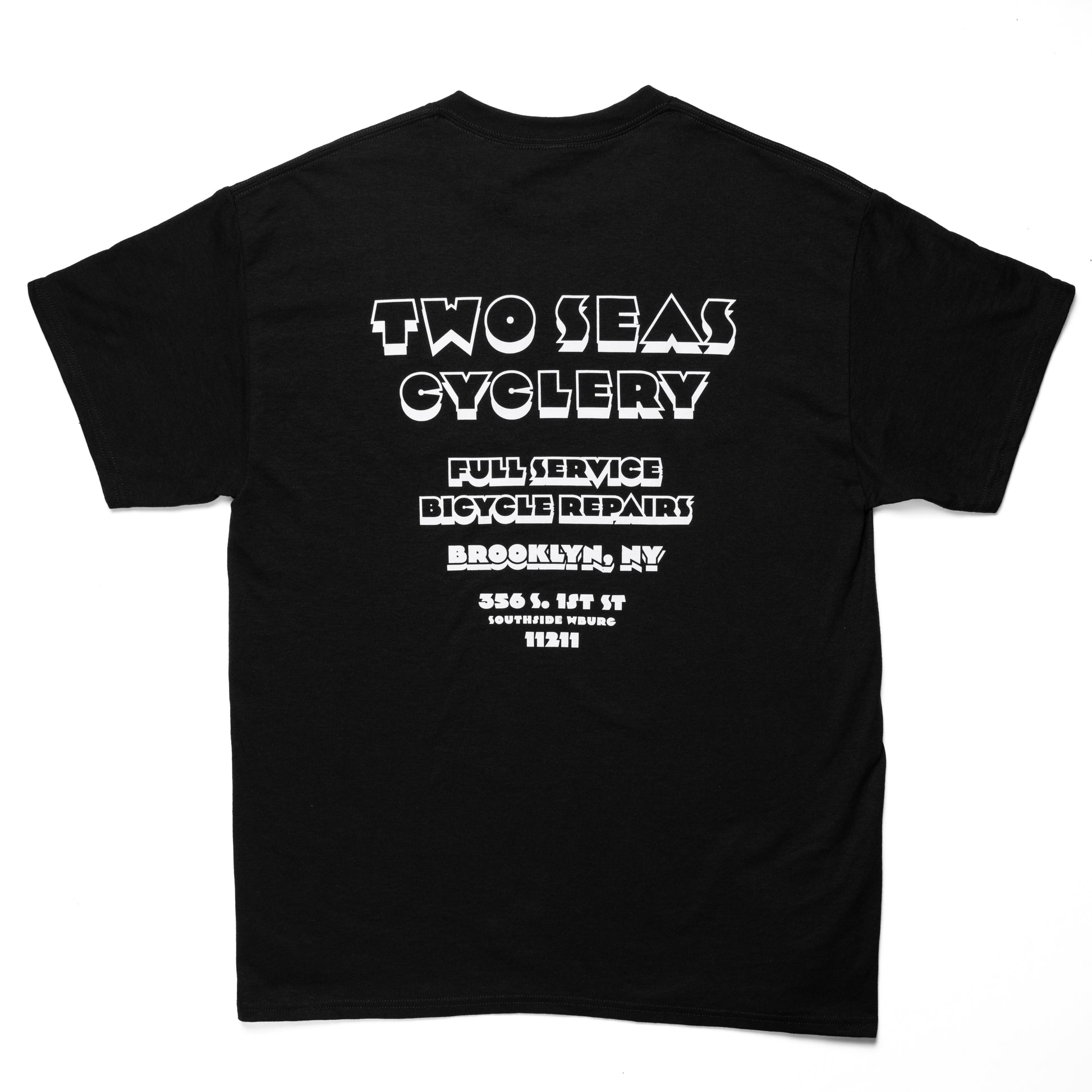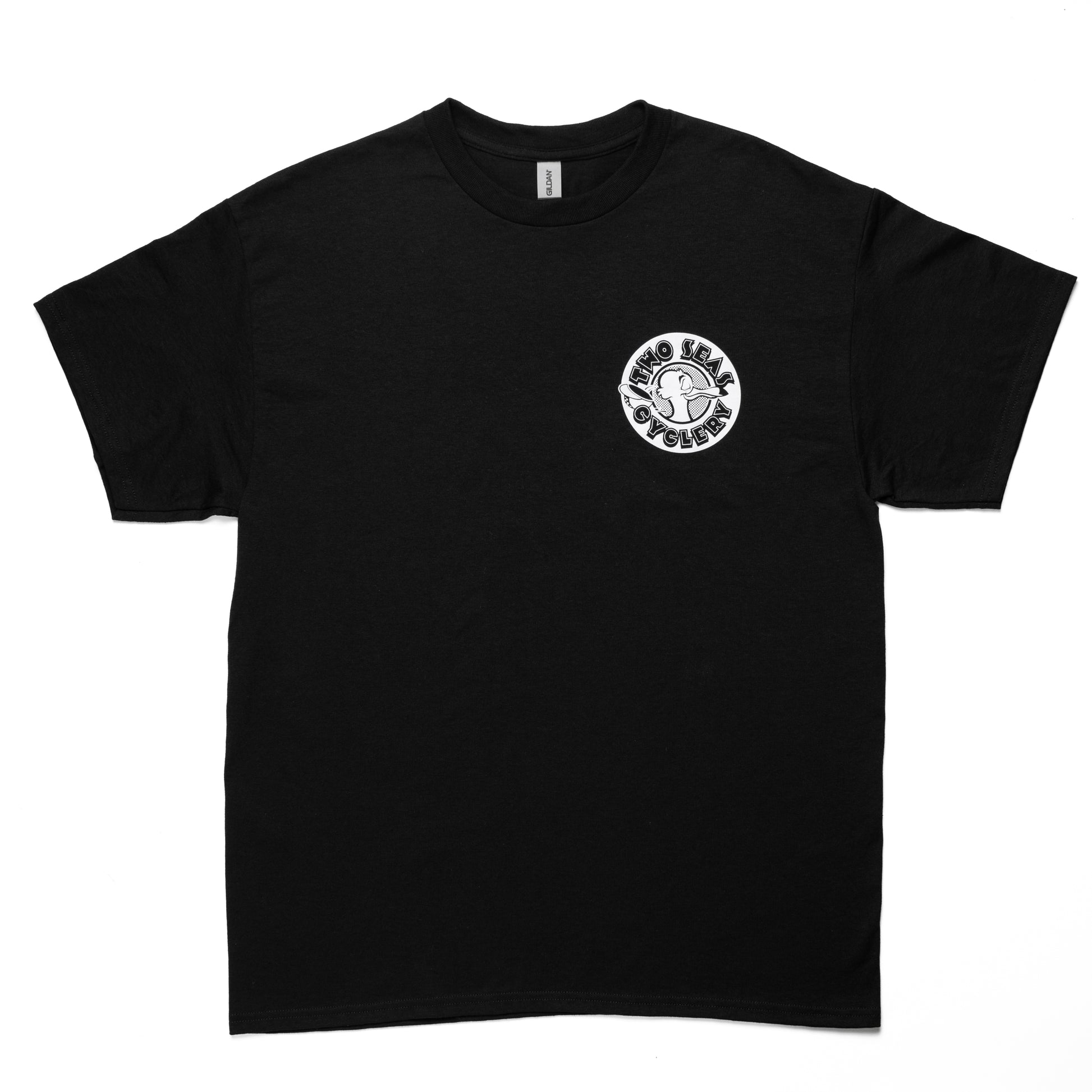 Short Sleeve T-Shirt with our 'Head Mascot' logo on the front left chest and on the back, we printed the shop's location + info.