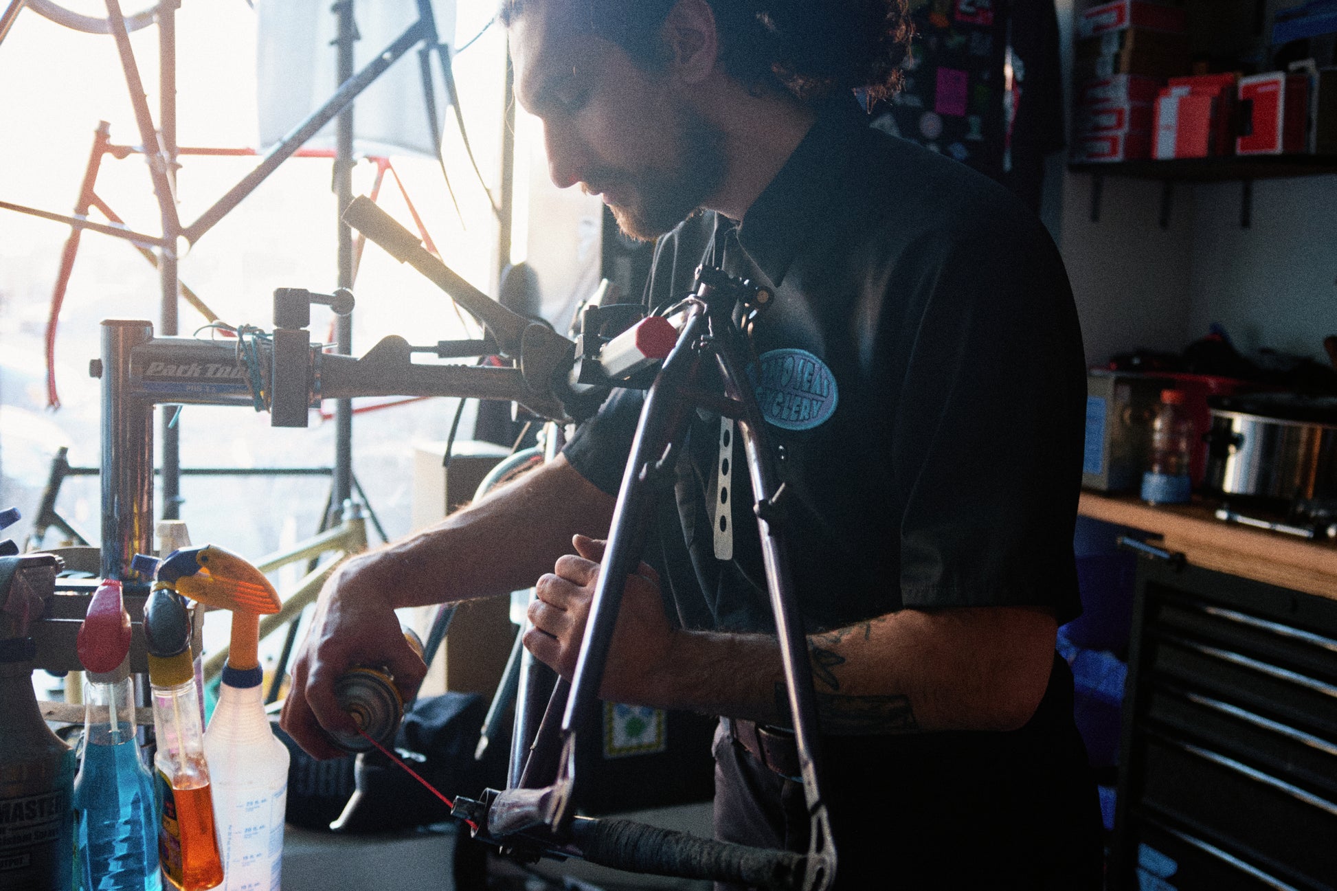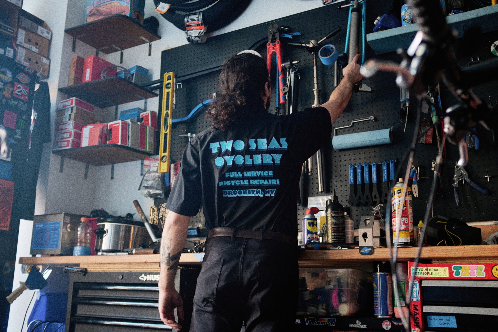 Front: Embroidered oval shop logo patch, sewn onto garment